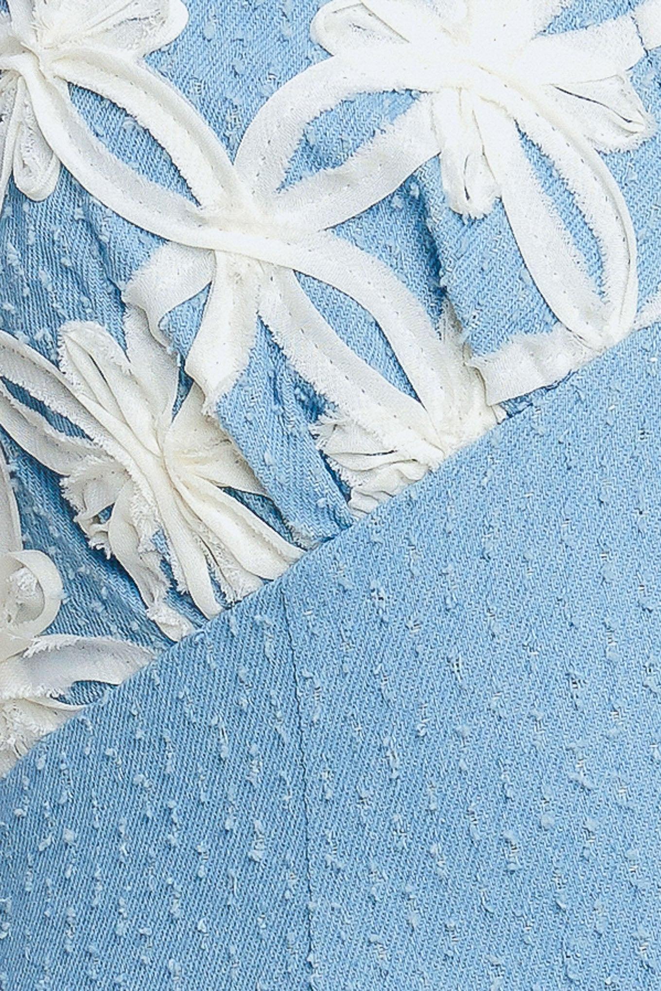 A textured woven mini dress featuring halter neckline with lace on top bust, circle skirt, back neck tie, smocked back bodice with zipper closure