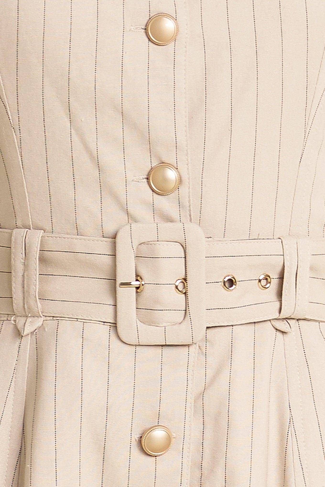 A striped woven midi dress featuring square neckline, sleeveless, button down, self belt and circle skirt
